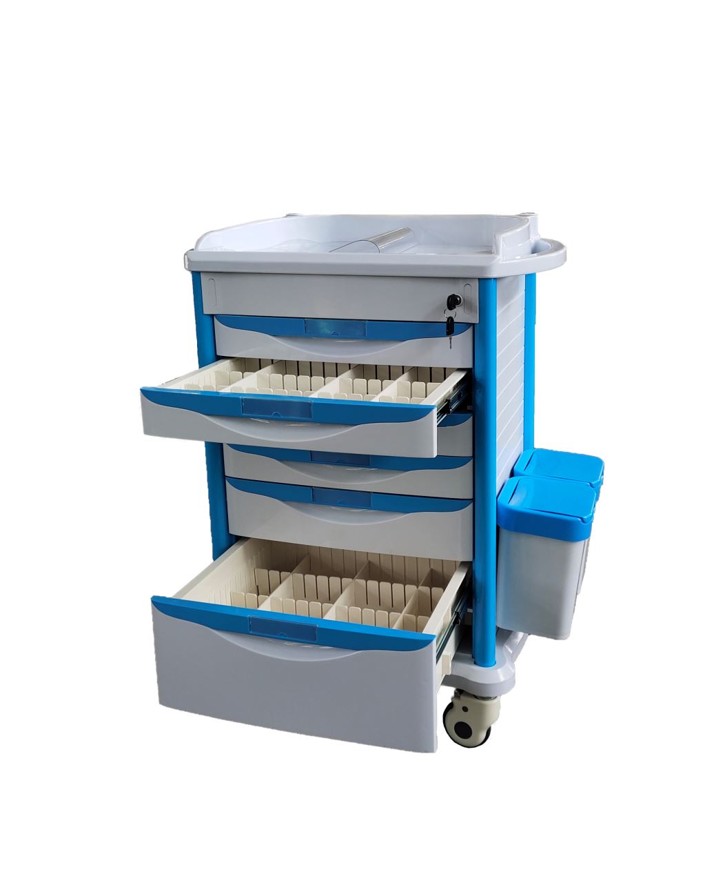 De medicijnwagen beschikt over een strakke uitstraling, de medicijnwagen is vervaardigd uit duurzame materialen zoals aluminium stijlen en kunststof panelen en lade. De medicijnwagen heeft 6 lades; 4 smalle lades van 8 cm hoog, 1 middel hoge lade van 12 cm en 1 hoge lade van 20 cm. De lades zijn voorzien van vakverdelers. De lades kunnen worden vergrendeld met een sleutel. De medicijnwagen heeft 4 zwenkwielen waarvan 2 met een rem.